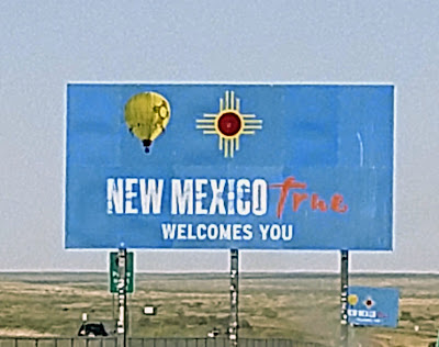 At last, we are welcomed by New Mexico. As we were about to pull out from the Rest Area, Mary Jane did a walk-around of her RV and discovered that a tire on the passenger side had literally disintegrated while we were sitting there. It was fine when we stopped but, better to have it happen while you are stopped. She called her roadside service so we decided to have an early lunch while we waited. We waited about an hour or so and she bought a new tire as her spare was not good.